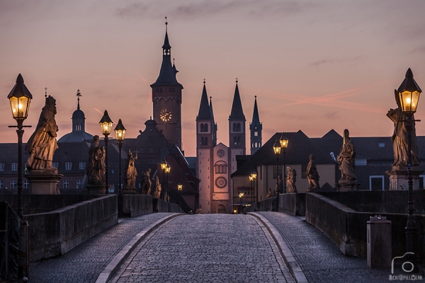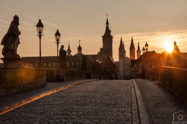 Die Schoppenfetzer haben sich alle getrollt und doch …  selbst um diese Uhrzeit ist die Alte Mainbrücke alles andere als leer: Frühsportler, Brötchenholer, Nachtschwärmer…